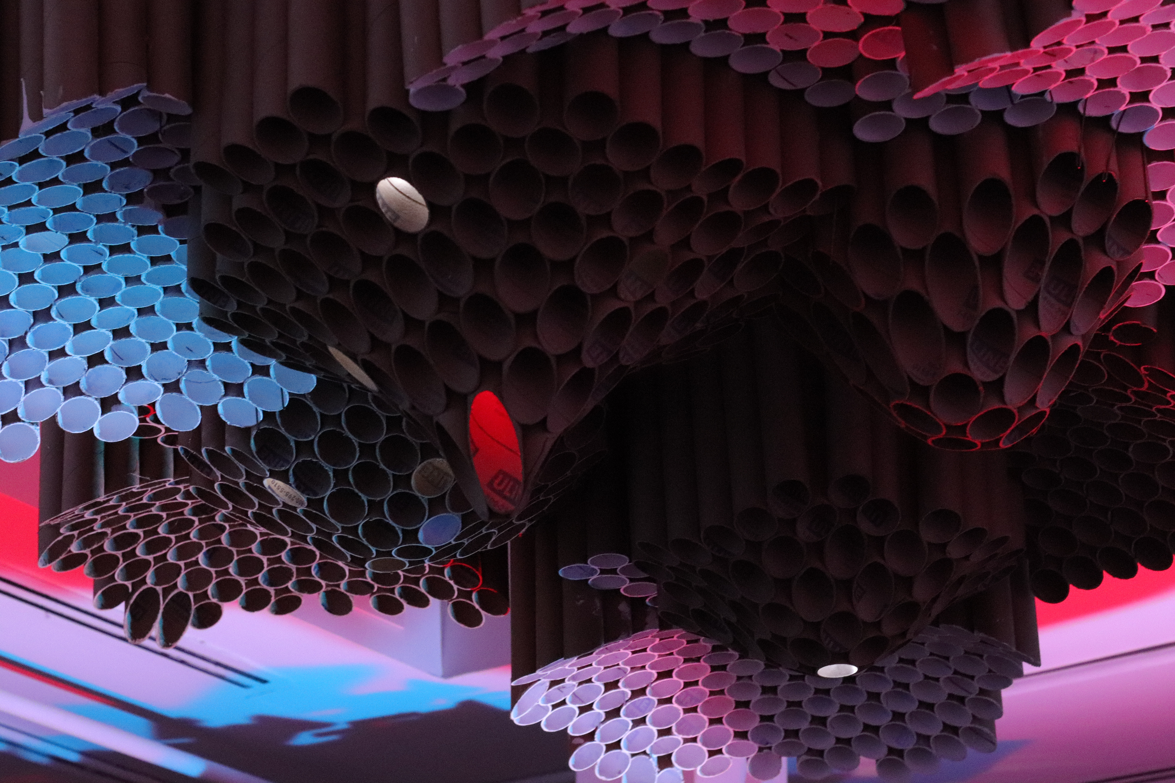 Stage: Completed Design: 2019 Area: 6’ x 6’ | 1.8m x 1.8m Budget: $ Category: Art | Architecture Installation The art installation is a composition of cardboard tubes that create a formation of extruded circles. Each element exists in symbiosis with its surroundings, producing the “Ripple Effect''. A structure of 6’x 6’ in size is suspended from space within the opening of the existing skylight, creating a gathering place under it. Viewers can look up and explore the aggregated “landscape” above them. This installation is a representation of the module that could be endlessly repeated and serves as a multiplier. Floodlights in a red or purple tone illuminating it from above will aid the visual impact of the piece. An overhead installation that is hanging on fishing lines makes it a stand-alone floating object. In collaboration with Studio XL.